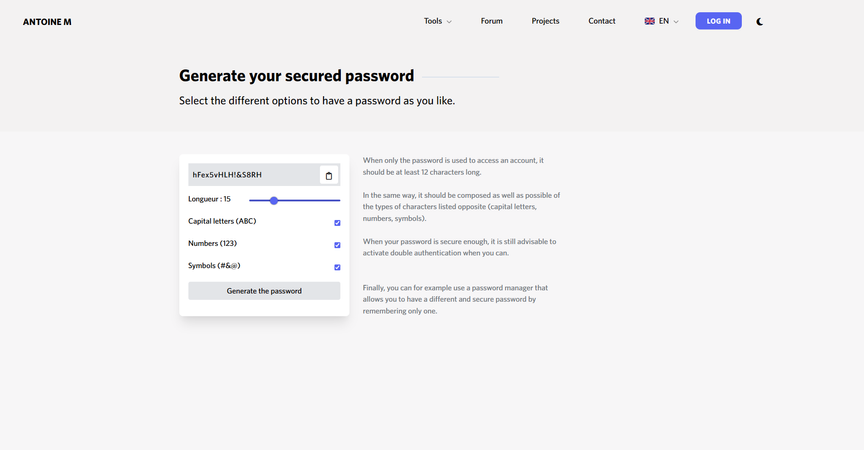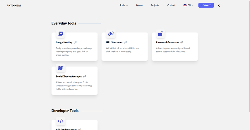 The website includes a portfolio home page, some tools – URL shortener, image uploader, an API with image generation, and more.